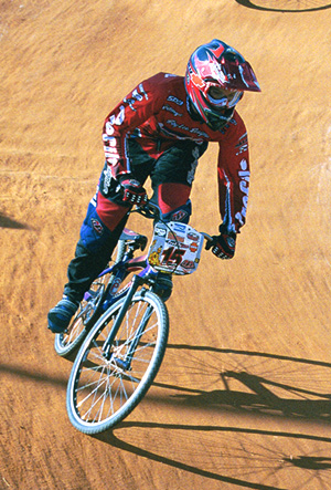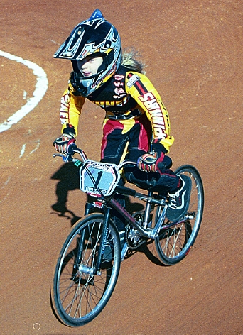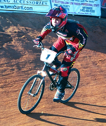 Anyone at the Opener couldn't help but notice J & R Bicycle's Kelly Hutto. Last year she took home double Florida #1 plates, and is looking to do the same in 2003. She definitely started out on the right foot, because she didn't loose a single moto or main all weekend long in either 15 Girls' 20" or 14-17 Girls' Cruiser. Second place both days were Jessica Ehlers in class and Megan Tompson in cruiser.