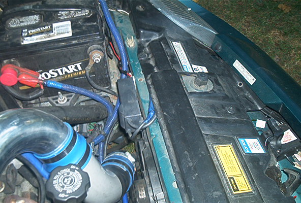 This is how the engine bay should look placement of the transformer may vary but generally you want to scrape the paint in a small area about 1" by 2" this is the area where the metal bar on the transformer will be mounted so make sure your two leads from the "glow sticks" reach the transformer and that the wires a accessible to hook up the switch.