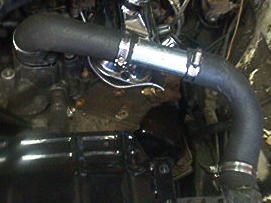 I went to the local junk yard that supplied all the parts for this project, R&R Salvage, and walked the yard for about 2 hours just gathering different assortment of radiator hoses. I also had a piece of flex radiator hose laying around the garage so I kept that in mind. After lots of cutting and thinking I came up with what worked best. Of course I did not find one that fit with out splicing, so what I had to do was take a piece of 1 1/2" exhaust pipe and connect the 2 hoses without any kinks. I used the flex hose for the bottom hose. You will see the hoses in the next few pictures.