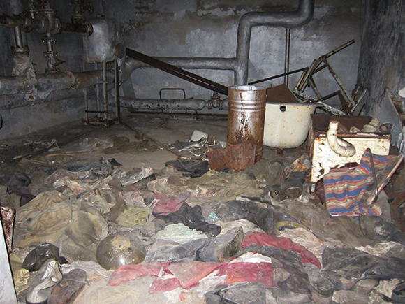 Those are the boots, helmets and other clothing worn by the firefighters and atomic plant personel who were first to arrive on the scene. The gear they wore is stored in the basement of a hospital. This photo is not mine. I am not going to the basement with radiation thousands of times above normal.