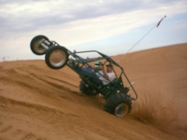 Here's a picture of my sister, Desaree' Groene in her Corvair powered sandrail! Her buggy specs: Invader Frame, 102 horsepower CORVAIR Engine, 280 Cam, Holley 500 Carb, Short Axle - Swing Axle, Disc Brakes, Neal Peddles, Neal Dual Handle Turning Brakes, 13.00 Plus Sand Tires Unlimited Paddle Tires.