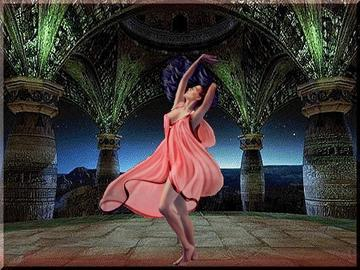 Dances on, naked hips free and inviting, rocking, pulsing as the beat plays onward, feet moving fast through the sand, splashing it up in gentle kicks, her arms snaking across her belly, teasing her nipples as her hands push higher, lifting her hands to blue veil concealing her hair, pulling it away as she tosses her head back, long ebony ringlets washing down her bare back like black serpents.