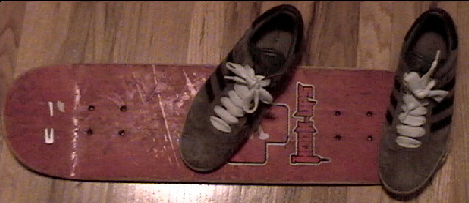 This is one of the most basic trick to do on a skateboard. I will not lie to you it isnt EXACTLY THE EASIEST TRICK but once you get it is easy. Well FIRST I would recomend trying it not moving; try it on a side walk or flat street. You first place your feet as shown in the the photograph*(itis the same foot positioning for regular footed riders). If it is your first time you may feel like you can not balance on the board when standing on it too long. Dont worry about it that is normal(you will get use to it:-) Once you are on it apply pressure to your back foot on the tail and slide your other foot up towards the truck bolt holes near the nose of the board. Then as you lift balance your feet out so they get to about the same level in the air. Let the board and your feet land back down. It will take a wile to get it. Dont worry if you dont get alot of POP(height) it takes time and practice. ***VERY IMPORTANT*** AFTER YOU TRY IT FOR A WILE TRY TO DO IT MOVING. A BIG MISTAKE I made was spending too much time practicing ollieing wile not moving. In the end it took me months to do a good ollie moving. So dont be discouraged just keep trying and learn from my mistakes. Wile you are practicing the ollie you should take breaks and try other tricks(Mabye you can do a shove it or something else not involving to much pop and skill). #####CHECK OUT CHRIS MARTINS PICS TO SEE THE TIP ON HOW TO POP HIGHER LIKE KENNY REED IN THE BACKGROUND. BELIEVE ME YOU WILL WANT TO SEE THESE TIPS THEY REALLY WORK. I USED THEM AND I CAN OLLIE 4 DECK FLAT GROUND, NO RAMP#####