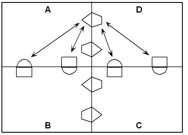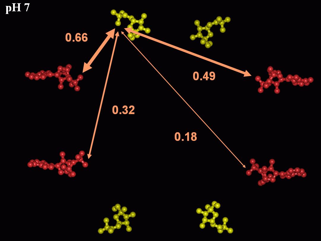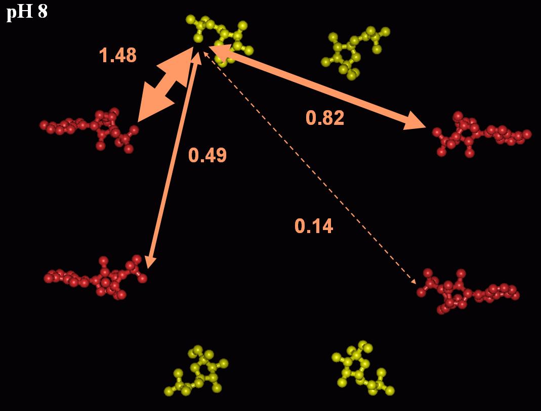 In the following four images, arrows are used to indicate (via a numerical representation as well as relative thickness of the arrow) the impact the bonding of each allosteric site has on the active site. First is the Common Model approach. Following that are Dr. Reinhart's results in varying pH solutions (indicated at the upper left corner of the image).