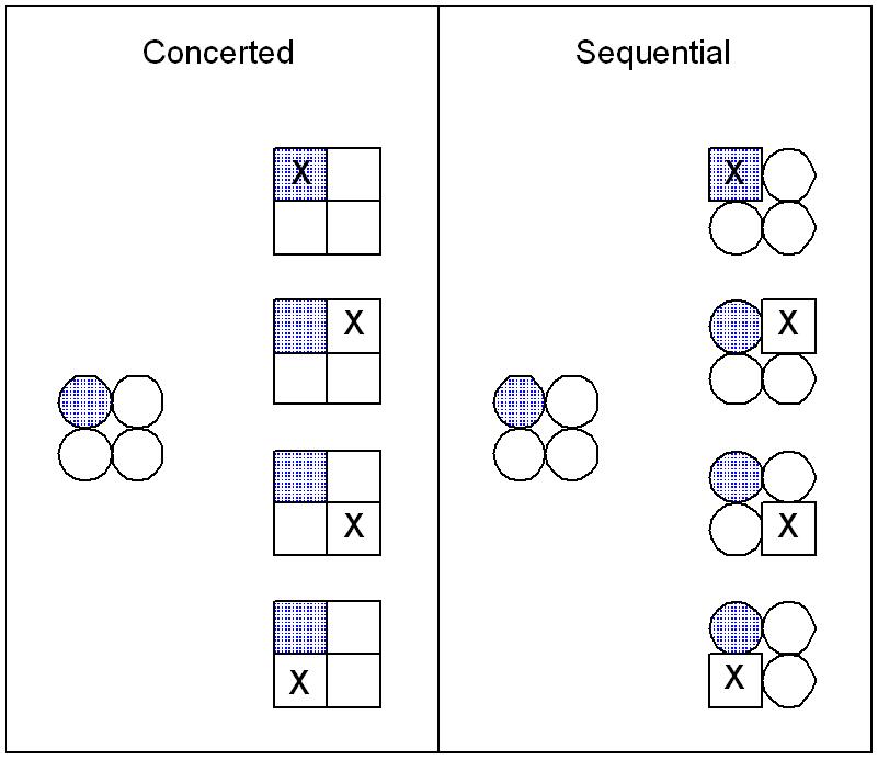 The sequential model of allostery holds that subunits are not connected in such a way that a conformational change in one induces a similar change in the others. Thus all enzyme subunits need not exist in the same conformation. To summarize: