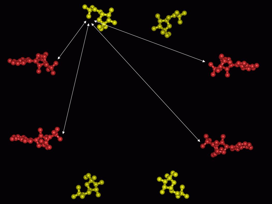 This is the same picture as the previous image, but only the parts of the enzyme relative to Dr. Reinhart's experiment are shown. Yellow structures represent active sites on the enzyme. Red structures represent allosteric sites.