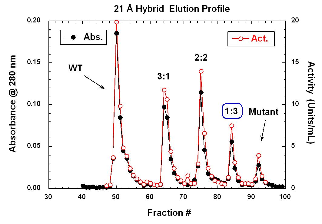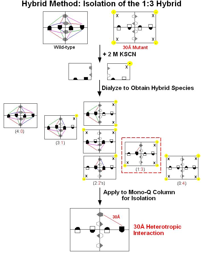 Through manipulation, all but one active site and one allosteric site were completely inhibited. The pattern of inhibition was rotated four times so that each allosteric site had a chance to opperate along with the chosen active site. At the same time, negative markers were added to the molecule so it could later be determined from other hybrids.