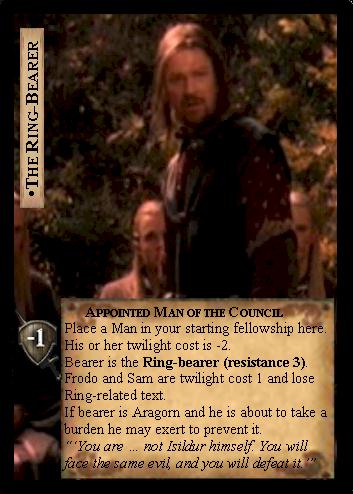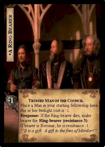 ![]() ![]() The hearts of Men are indeed easily corrupted. So much so, in fact, that if Boromir must be the backup Ringbearer, he has a mere 2 resistance. Men must be able to prevent burdens or remove them as they come- Extraordinary Resilience would be a good card to add to a Man bearer deck. Aside from these weaknesses, Men are strong skirmishers, an ability only enhanced by the rare Ring. Try them out- if you're not scared of losing in the rarest way: corruption. << Back to Alternate Ringbeaerers |