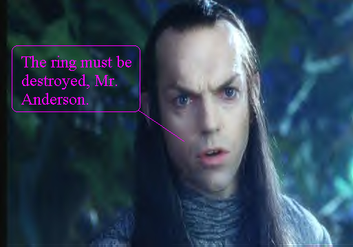 Here we have several product of pure boredom on my part. Inspired by the LOTR captions on www.ninecompanions.net, I have taken random pictures from all over the internet and added captions. I hope you like them! If you have a picture you want to add, email it to me at puppypalluvsanime@lycos.com. If you have a picture you want me to put a caption on and then put on the site, also send it there. Thanks! And remember, I did NOT create these images, and I do not own the rights to Lord of the Rings characters. Sadly. I only tinkered with them a bit for the sake of humor. ^.^