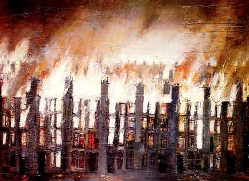 An Oil Painting of the Terraces by Scottish Artist Tom McKendrick tells all of what happened when Clydebank was bombed on the second night with incendiares.
