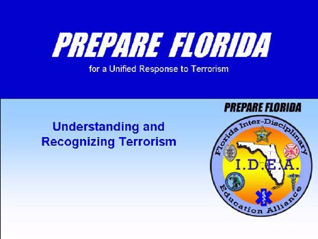 | I teach a course called Prepare Florida. The course is designed to prepare all first responders in the state of Florida to be aware of the potential of terrorist incidents. |