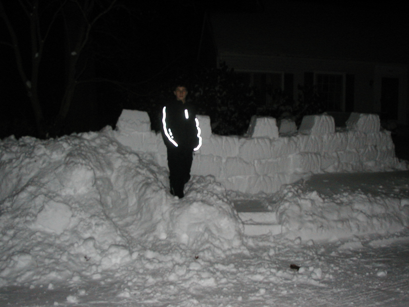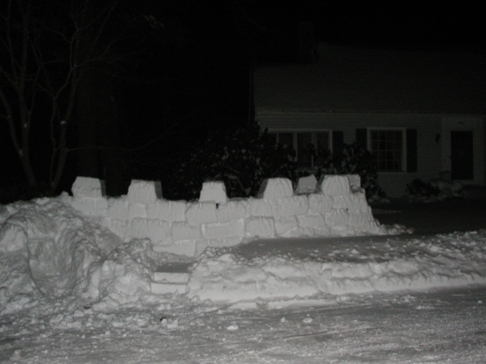 W made this out of large 2 feet by 1.5 feet by 1 foot blocks. The Block wall is built in to snow mound which is like a bunker in the castle, it will protect you when you get bombed in a snow ball war. The entrance goes directly through the bunker in to the main room by a tunnel, to slow entering invaders.