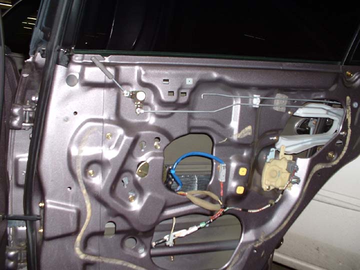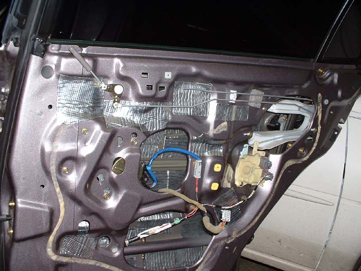 Now for the back doors: As you can see, there is 1 screw inside that black holder, and there's 1 screw by the handle. Unscrew those, and to take out that part of the arm rest (see pic), you need to use the door removal tool (easier) and start opening it up. One thing though, there's like a hook in the front part of this (by the window opener), so you gotta push this back and then tilt it up. Hope you got what i said. And for the door handle, is mostly the same too. Once you get those the armrest part out (the door handle won't come out until later), use the removal tool around the cover until it comes loose. Then, using a small screwdriver, take out the lock part (there's a square part surrounding it). After that, the way to take out the plastic cover is by sliding it upwards. Be careful, once you get it semi-out, just slide the door handle thru the hole, so then you can disconnect it easily. This is how it would look after you take it out. PS - Make sure you clean the bare metals where you would be putting Second Skin, it's an important step. And after you lay everything out, use the roller to smooth everything out. Then with a razor, start prying the plastic cover out (Honda used silicon i believe or some other plastic) by cutting the silicon so the plastic cover would just come out. Left - With SecondSkin Right - Just bare, with plastic cover out. You can see i mostly put Second Skin on the inside of the car (i think it's better and there isn't much space to put it in the outer part). Here are some closer looks at the inside: So now we gotta put the plastic cover back. Make sure you clean the metal and the plastic. Left - Plastic with the new silicon applied. Right - Just put the plastic back and make sure you don't have any excess, so just smooth everything out with your fingers. Now just put everything back and done!! Well done my friend, it took a while, but it should be worth it (The things that we audiophiles do to get rid of the ghetto ass rattlings). I would leave the car bare like this overnight so that everything just cures. Finished 2/24/03