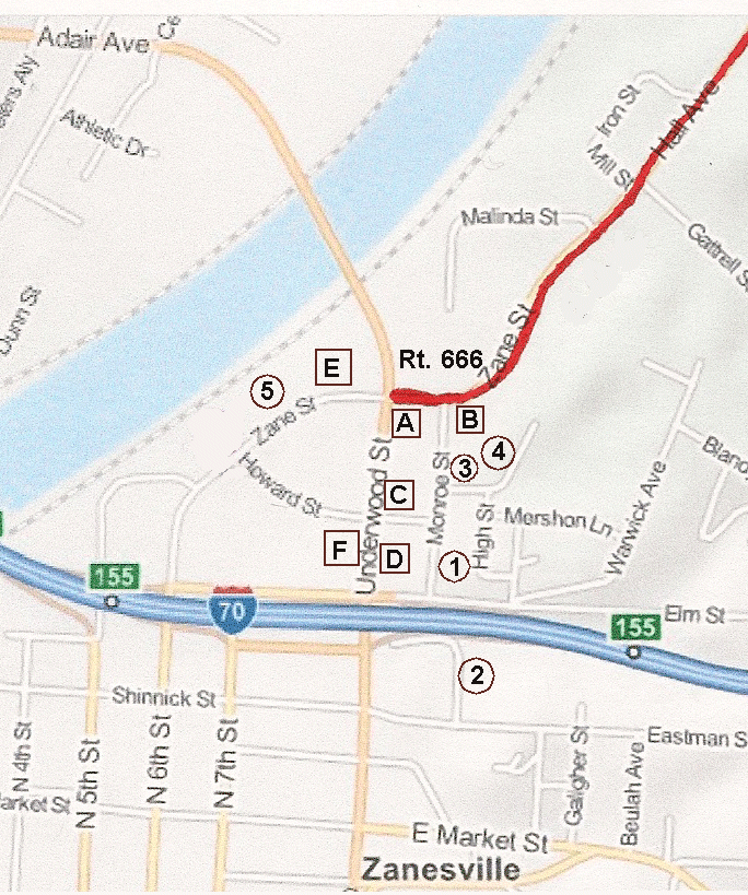 As one author has written: "From the South, St. Rt. 666 is treacherous at times, with hidden curves, extremely sharp corners, and a blind single lane tunnel beneath a rail road. Although, it is not as dangerous as riding from the North. The right hand lane, travelling to the South, often is consumed by the river alongside, leaving an unforseen cavernous hole that lays waiting to consume the driver of any vehicle. Angels may be seen waiting along the route; none of which hover aloft. Could these be seeking all souls lost in the aftermath of crashing headlights and twisting steel, as a rider becomes suddenly aware he may breathe his last?" Adding to the eerie ride on Rt. 666 North is the Zane Casket Company on the left beyond the post office and livestock auction house. The past two years the hand of the Devil has reached forth from the river and snatched away the south bound lane of the byway, as also witnessed in years past. On Rt. 666 is a small unincorporated village known as *Deadmans. It is geographically surrounded by 12 *cemetaries less than 4 miles away. The average walking speed of a human is 4 miles an hour, making Deadmans a perfect place to haunt. To this, add the fact that Zanesville High School is known as the Blue Devils. At just over 14 miles in length (14.17), OH Rt. 666 is an exciting ride that beckons from both directions. (See Map at Bottom) |