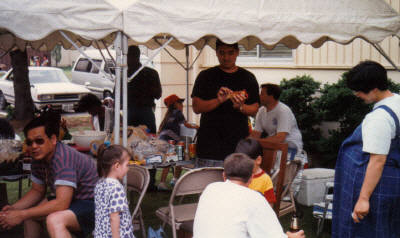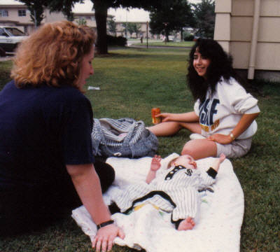 Mrs. Garner and Mrs. Knox talk while little Lee Garner plays on the blanket