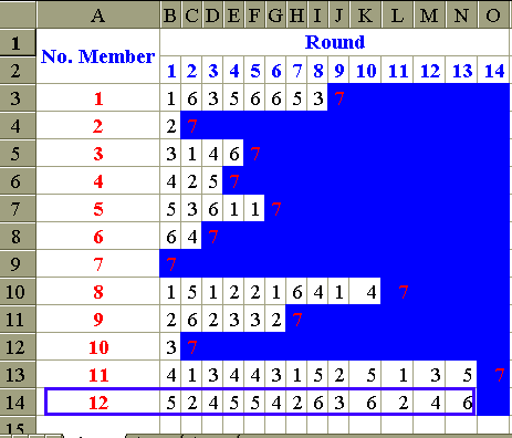 เพื่อให้เห็นตัวอย่างชัดเจนขึ้นดูภาพข้างล่างครับ ในกรณีมีสมาชิก 12 คน และให้นับถึง 7 จะเห็นว่าถ้าจะ ให้อยู่รอดเป็นคนสุดท้าย จะต้องยืนอยู่ในตำแหน่งที่ 12
