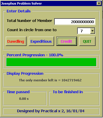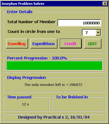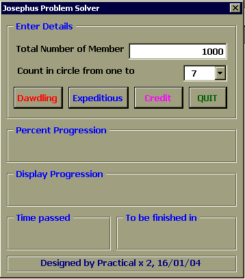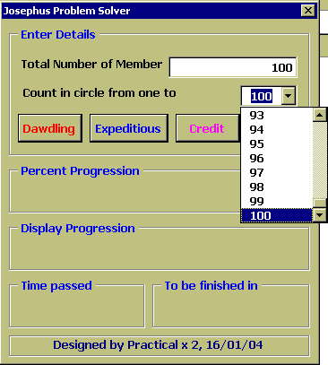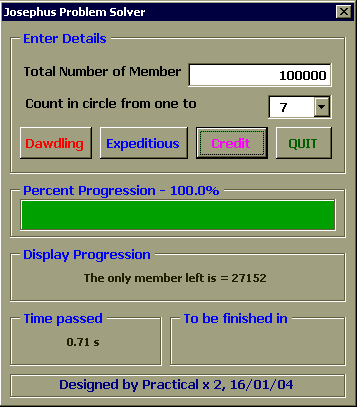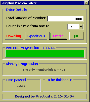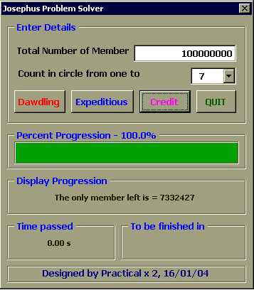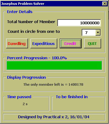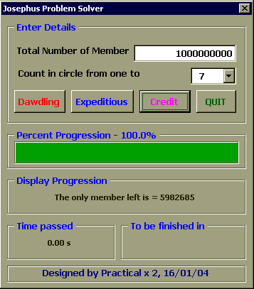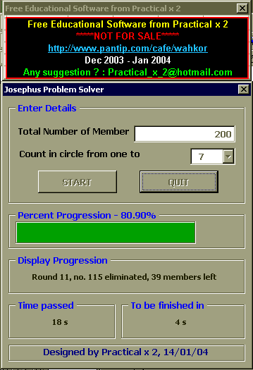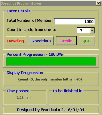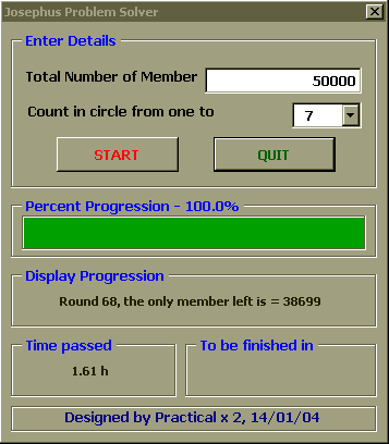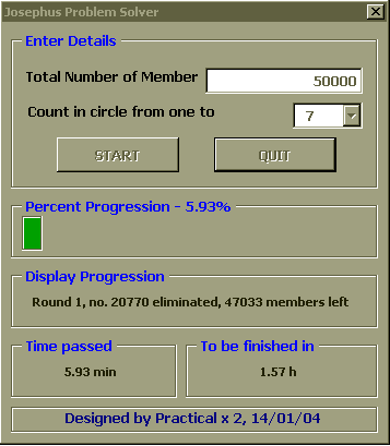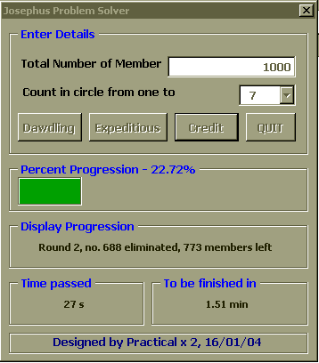 เพื่อพิสูจน์คำตอบนี้เราจำเป็นต้องใช้คอมพิวเตอร์มาช่วยแก้ปัญหา ซึ่งเราสามารถใช้ EXCEL2000 และ VBA6.0 ในการณ์นี้ได้อีกเช่นเคยครับ, dialog box ข้างล่างสาธิตการใช้โปรแกรมสำหรับคำถามข้างบน ซึ่งตัวโปรแกรมจะแสดง progress bar, เวลาที่ผ่านไปนับจากเริ่มการวิเคราะห์, และประมาณเวลาที่เหลือ ก่อนโปรแกรมจะรันเสร็จไว้ด้วย พร้อมทั้งแสดงรายละเอียดสมาชิกที่กำลังถูกคัดออก รอบที่วน และจำนวน สมาชิกที่เหลืออยู่ เพื่อน ๆ สามารถใช้โปรแกรมนี้สำหรับกรณีที่มีสมาชิกตั้งแต่ 2 จึงถึง 50000 คน ครับ และ อาจให้นับถึงตั้งแต่ 2 ไปจนถึง 20