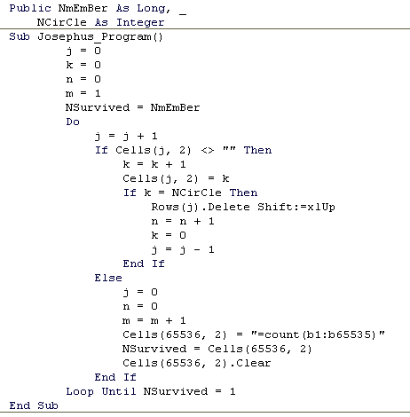 การแก้ปัญหาโดยตรง จะช้าครับ ซึ่งคุณ packham ได้แนะนำวิธีแก้ปัญหาที่เร็วขึ้น โดยการใช้ความสัมพันธ์ แบบเวียนบังเกิด โดยค่อย ๆ นับขึ้นจากกรณีที่เราทราบคำตอบ ที่มีสมาชิก m จำนวนน้อย ๆ ตัวอย่างเช่น ถ้ามีสมาชิก 30 คน และนับถึง 7 เราทราบว่าในกรณีที่มีสมาชิก 3 คน คนที่เหลือรอดคนสุดท้ายคือ คนที่ 3