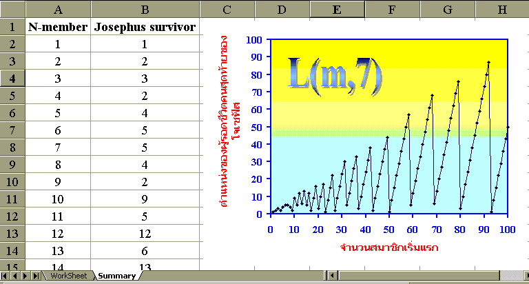 ตัวอย่างกราฟแสดงความสัมพันธ์ระหว่างตำแหน่งของสมาชิกที่เหลือรอดเป็นคนสุดท้าย (L(m,7)) กับจำนวนสมาชิก ซึ่งคำนวณไว้จนถึง 100 คน จากการให้นับถึง 7