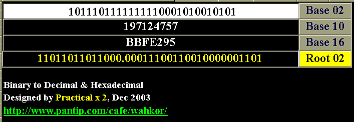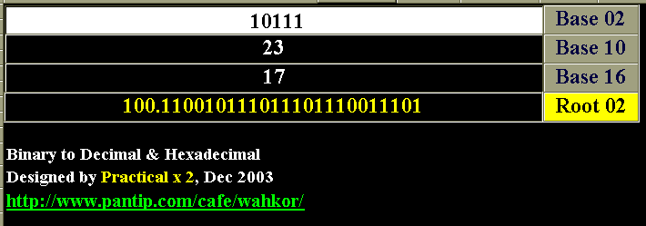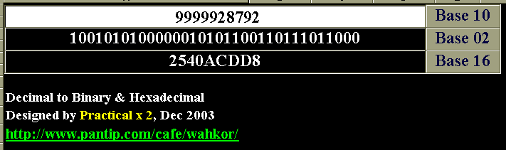 ฐานสอง และฐานสิบหก (หรือในทางกลับกันด้วยครับ) โปรแกรมนี้พัฒนาขึ้นโดย EXCEL2000 ครับ ซึ่งจะรันได้ดีที่สุดใน Version 2000 ส่วนใน Version 97 อาจมี