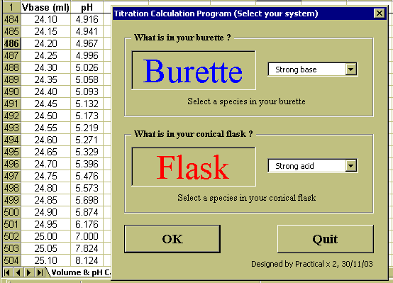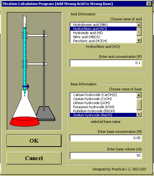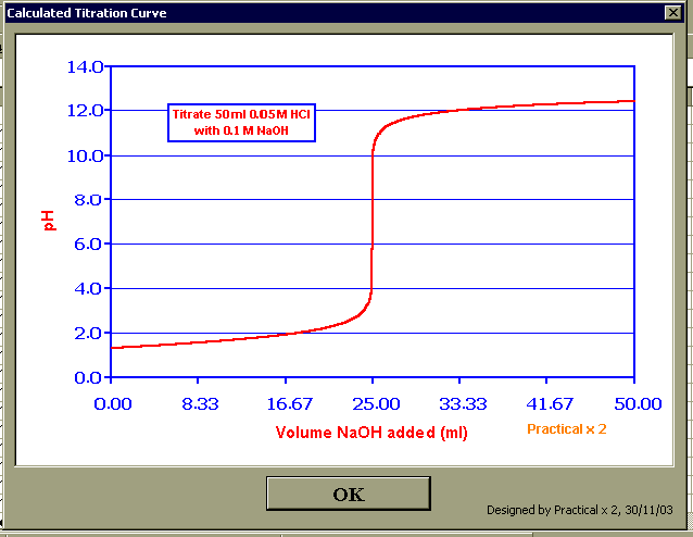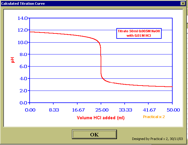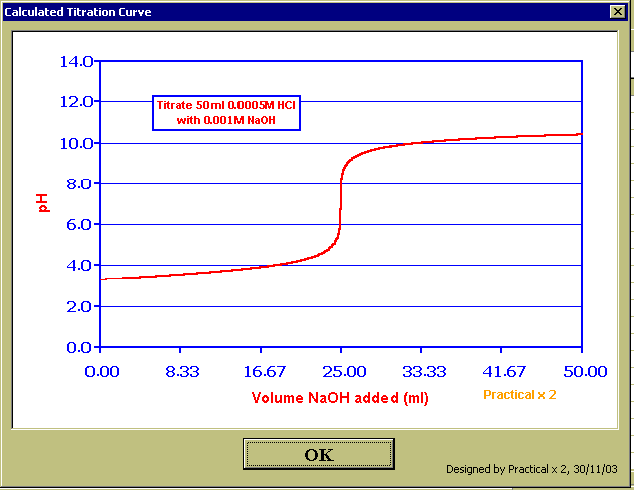 จะเห็นได้ว่ากว่าที่เราจะได้เส้นโค้งไตเตรชั่นออกมา ต้องมีการคำนวณที่ประกอบไปด้วยสี่ขั้นตอนนี้ และเพื่อ ที่จะให้สร้างกราฟได้ต้องมีการคำนวณหลาย ๆ จุด ในขั้นตอนที่สองและสี่ ซึ่งเป็นการคำนวณที่ซ้ำไปมา เรา อาจให้คอมพิวเตอร์คำนวณให้เราได้ครับ โดยเฉพาะถ้าเราต้องการเปรียบเทียบว่า เส้นโค้งจะแตกต่างกัน อย่างไร ในอีกกรณีที่ เรามีกรดไฮโดรคลอริก (HCl) ความเข้มข้น 0.000500 M ปริมาตร 50 ml อยู่ในขวดรูป ชมพู่ และต้องการหาจุดสมมูล (end point) และเส้นโค้งไตเตรชั่น จากการไตเตรตด้วยสารละลายโซเดียมไฮดรอก ไซด์ (NaOH) ความเข้มข้น 0.001000 M ถ้าต้องคำนวณซ้ำอีกก็ยุ่งยากแน่นอนครับ