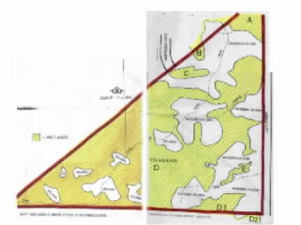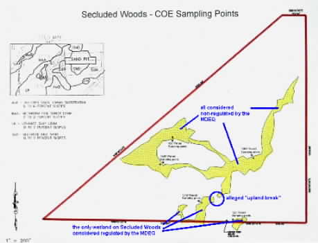 This is the strategic so-called "upland break" that caused the MDEQ to not require a permit for impacts to about 3 acres of already very tightly delineated wetland on Secluded Woods. The blue circle marks the alleged "upland break" area. The yellow area to the north is all considered non-regulated wetland. The small yellow areas to the south are the only areas considered regulated by the MDEQ.