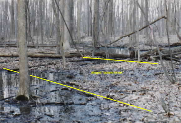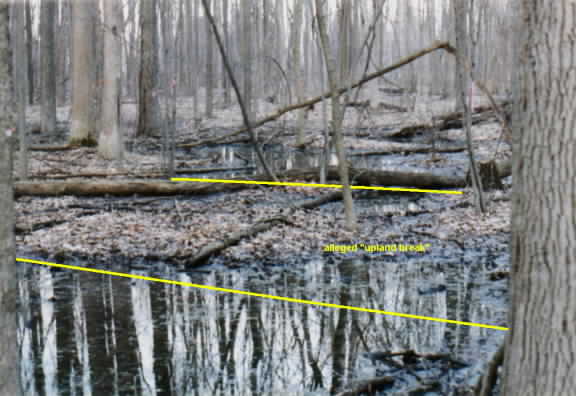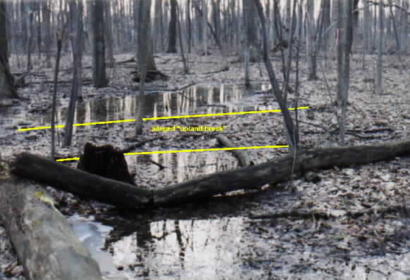 Both the National Wetlands Inventory and MIRIS maps indicate that much of the site is a large palustrine, lowland hardwood forested wetland system. A 1992 preliminary wetland determination by Dr. Eugene Jaworski of J & L Consulting Services indicated that approximately 65% or about 18 acres of the Secluded Woods parcel was wetland. A 1998 delineation performed by King & MacGregor Environmental, Inc., and approved by the MDEQ, indicated that only 0.17 acre of the parcel was regulated wetland consisting of two small areas along the south property line, tucked well away from the central development area desired. These small areas are part of a much larger wetland area contiguous with Lake Saint Clair and the Salt River. To the north of this, they delineated only 2.9 acres of wetland, and determined that it was separated from the larger wetland area to the south by a so-called "upland break" of only about 8-foot wide by 20-foot long, and with not more than about a 1-inch rise in elevation. This served to disconnect the majority of the wetland to the north from the larger, contiguous wetland to the south, and being noncontiguous and under the 5-acre threshold, the northern 2.9-acre wetland area was determined to be unregulated by the MDEQ. The primary basis for the so-called "upland break" was described as a seasonal dominance of Wild Geranium - Geranium maculatum, classified by the U.S. Fish & Wildlife Service as a Facultative Upland (FACU) species, which by even there own classification still has a 1% to 33% chance of occurring in wetland. However, wetland delineation requires consideration of all dominant species in all vegetative layers (canopy, understory, herbs, etc.). In this particular area, other dominant species include Silver Maple - Acer saccharinum and American Elm - Ulmus americana, both Facultative Wetland (FACW) species, Blue-beech - Carpinus caroliniana, a Facultative (FAC) species, one American Basswood - Tilia americana, a Facultative Upland (FACU) species, Common Spicebush - Lindera benzoin, a Facultative Wetland (FACW) species, and several patches of woodfern, either Boott’s Fern - Dryopteris x Boottii or Spinulose Woodfern - Dryopteris spinulosa or a hybrid of both. Boott’s Fern and Spinulose Woodfern often hybridize, making a distinction between the two species difficult, but both species are Facultative Wetland (FACW) species. As a whole then, the plant community in the so-called "upland break" is a wetland community (FACW to FAC), rather than an upland community as represented by Wild Geranium, one single FACU herb species. The Detroit District of the U.S. Army Corps of Engineers disagreed with the so-called "upland break", stating that it doesn’t exist and determining that the entirety of the wetland on the Secluded Woods parcel was under their jurisdiction, as well as the larger wetland area on the adjoining 3 parcels. They upheld this position through two administrative challenges by the developer. Therefore, they required a permit for the proposed wetland impacts, primarily three road crossings. These impacts were approved through Nationwide Permits, which allow for what are considered small and routine wetland impacts for various classes of projects, such as road crossings. They grant permission without need of a permit application as long as the activity falls within the criteria of the Nationwide Permit, and so are relatively easy to make use of. However, the MDEQ has not required a permit for these same wetland impacts. It is our opinion, and supported by the U.S. Army Corps of Engineers, that permits are legally required for impacts to any of the wetland delineated on these 4 parcels, because it is part of a larger wetland area contiguous with Lake Saint Clair and the Salt River, and also because most of it is part of a wetland area greater than 5 acres.