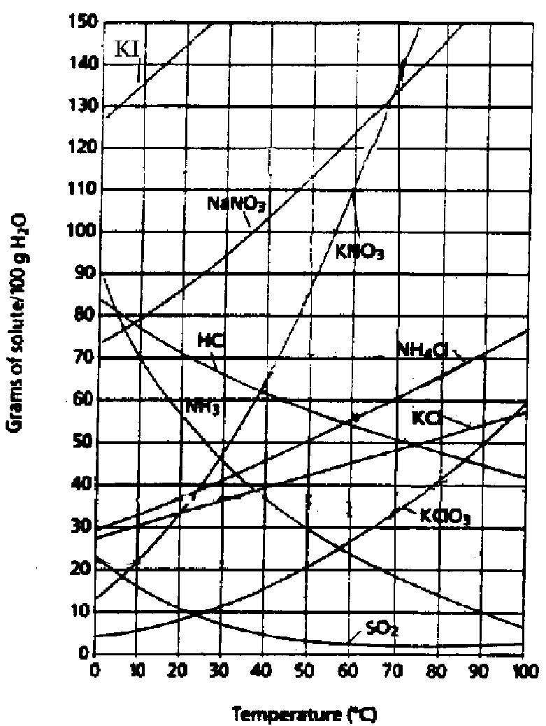 ***BONUS: On the solubility curves, why do the solubilities of ammonia, hydrogen chloride, and sulfur dioxide decrease with increasing temperature, whereas the solubilities of the other compounds increase? (Knowledge)