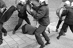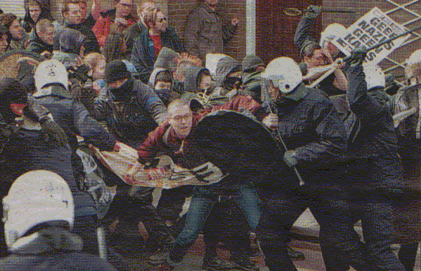 A policia holandesa esteve presente com a módica quantia de 500 policias para proteger 100 neo nazis de uma contra manifestação de cerca de 1000 anti fascistas, as várias tentativas de furar o barreira policial quase que se lograram, mas nunca foram conseguidas.