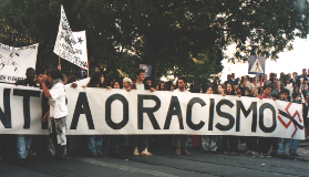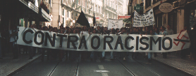 Mesmo com a policia nas redondezas, alguns já se atreviam a fazer uns graffitis pelo caminho, tudo com textos a ver com o sucedido. Quando iamos em direção ás ruas “pombalinas”, foi tirada a foto de que achamos a melhor do dia, e onde se pode ver a força do movimento anti racista em Portugal, sem palavras… realmente a união faz a força.