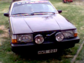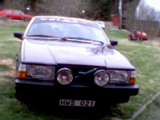 Utanpå: Spicallacken, Framruterstriper där det står Volvo Racing (svartbakgrund, silver/röd text), två extralysen (Hella Ralley 2000).