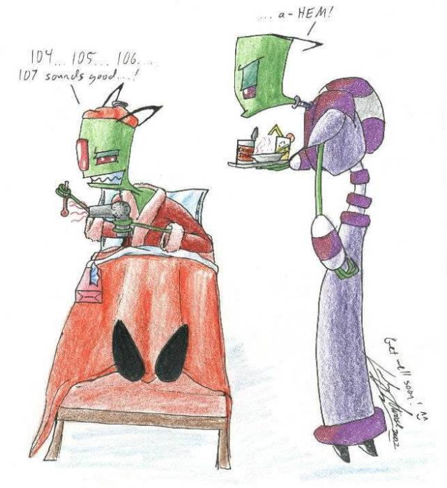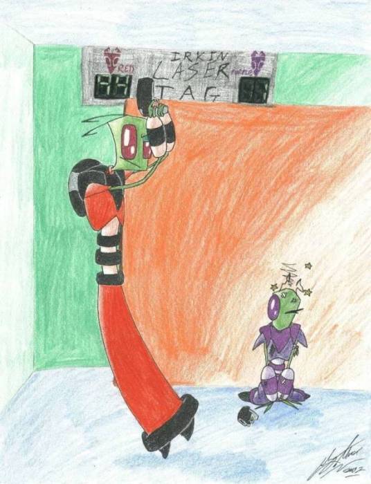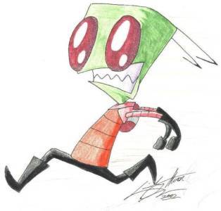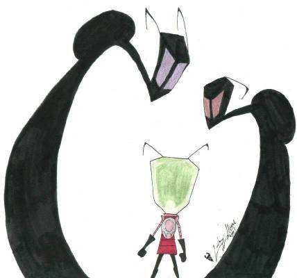 "Come along, Gir...." - Very cute! Based on a request from Zzy! Gir- "I still gotta hug in me!" Zim- "AAAAAAGH!!!" - *squeals* ADORABLE!!!!!Zim's Ohana- "These are my parents, I...um...love them with all my heart....I MUST HAVE PUNCH NOW!!!" (Note: My first time drawing the robot parents. And, for those who missed Lilo & Stitch, "ohana" is Hawaiian for "family") Dodgeball! - I can't begin to tell you how much I love this pic (looks like Dib's enjoying it too...) It was really awkward coloring the sky red though... I've wondered why it's like that in the show. ?_? ...It must be love... - Zim is...um...not too happy about this, I guess... although Dib's thrilled to death that there's someone who despises Zim as much as he does! Sgt. Hobo 678 - Apparently, Zim just doesn't know when to quit.... Typical Evening at the Membrane Household - I made Gaz's head a little too big, but I'm still proud of it! And I absolutely LOVE Dibby's expression!!! Dib tormenting Gaz - This is just too cute... In the initial sketch, I had Dib like he was holding up a UFO magazine with his right arm (the one NOT on Gaz's head, for the directionally-challenged), but when I did the final drawing you see here, I thought it really turned out better without it!Gaz tormenting Dib - REVENGE for the above pic!!! Aww! Gaz is really cute when she's happy! "RUN!!" - This is just so cute! I LOVE how Zim runs, the way he holds his arms up when he's running! ^_^ This pic is based on a button I bought at Hot Topic! Zim's Solution to his Altitude Problem - Awww! How cute!! He's trying to make himself look bigger!!! The scary thing is it's working...Actually, Wally had this pic and gave it to Richard Horvitz for me! YAY!!! Or at least I sent it to him to give to him... 0_o "AAACK!!!! MY SPINE!!!!!" - Heehee! (I cropped the heck outta this one, since the entire pic is only about 4" tall and about 3" wide! I just drew it for a gift banner for this site, so I drew it small so I wouldn't have to re-size it much. I also only scanned the outline for the banner and colored it on the computer, then colored the actual drawing by hand later, which is why they're so different.) Eerie Dib (from the opening scenes) - This is just weird. Turned out pretty neat-looking, though... The Demon-Teacher - Eep. "Probing the Membrane of Science" - Okay, so kids actually compete to do this?? Oh, and later on, I realized that it's not "Poking the Membrane of Science" like I thought, it's "Probing", so I changed the title of the pic. (My descriptions are a lot shorter now, aren't they? Don't worry, they'll pick up again in a minute! ^_^) The Tallest - This was my very first Zim drawing ever!!! I got off to a pretty good start, I'd say...not to be tooting my own horn or anything.................... (*toot*) "Zim...you're alive..??" - "Dangit. 6 months in a tiny Voot Cruiser with GIR singing didn't kill him..." Red & Purple's lunch break - Look at all those crumbs!!! Man, Red's a slob... (I shouldn't say anything. I had a bag of Cheetos on my bed for 2 weeks once.) ![]() The Irkin Rulers - Bah, I hated drawing the Massive (the Tallests' ship)!! I got bored on a drive (obviously I wasn't the one driving) to a local state park for a solar viewing (I saw a solar flare!!! ^_^ Yay!!!) and drew the initial sketch for this one on the way to and from the park.![]() Red's found a favorite pasttime!! - *LOL* I LOVE how Purple turned out!! Poor guy, he didn't stand a