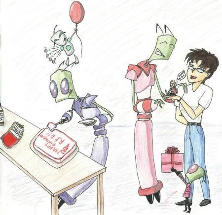 "Happy Birthday, Invader Moose!!!" - I had to make Dib & Zim a little taller in this pic, because it would've been even more of a pain in the butt to draw me leaning over any more than I already am! I also made Dib kinda Anime-ish, and Zim's giving me the thumbs up, because I've managed to somehow survive this many years on "this nasty rock", as Tak so accurately put it...!