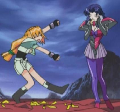 This Excel & Hyatt from Excel Saga. They work for the secret soceity of"Across".Excel is madly in love with the boss,Lord Illpalazzo. She has a dog that she uses for an emergency food supply.In the first episode she hasn't eat for days so she continously tries to eat Menchi. Hyatt is a space princess captured by the puchus, aliens that around fotun beaters, and recovered by Nabishin. She joined Across when she floated into it's headquartes during a flood.