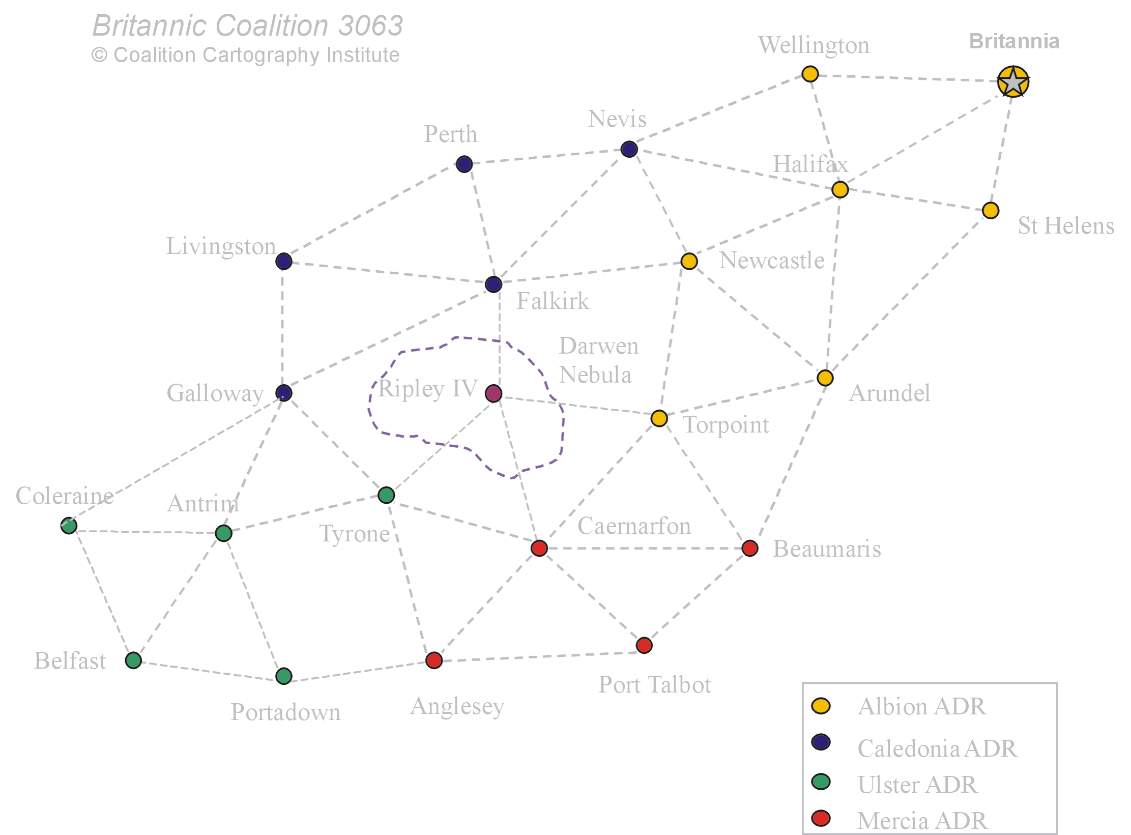 By the time the colonisation process had finished in 3063, a total of twenty additional worlds had been discovered, over a region of space roughly the size of the Arc Royal Defence Cordon. On the Anti-Spinward (Eastern) border of the Coalition is the Albion Administrative & Defence Region (ADR), consisting seven star systems; Britannia, Wellington, Halifax, St Helens, Newcastle, Arundel and Torpoint. Britannia naturally plays host to the state's seat of government and is also the location of the Regent's official residence. Much of Albion's industrial capacity is located on Halifax, Newcastle and St Helens. Arundel and Torpoint are largely unspoiled by human activity. The latter is a popular holiday resort, the latter a residential world.