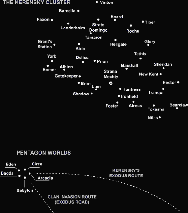 The Exodus reached its final destination in a region of space far beyond the Periphery, known as the Pentagon Worlds around 2 years later and the settlement of the people began. However, problems soon arose as they struggled to adapt to their new life. They were all military personnel, but it was quickly realised that they would need civilians to serve as scientists, merchants, labourers etc. if they were to have any hope of maintaining a viable new society. Kerensky ordered the demobilisation of around three-quarters of all his troops, determining who would be mustered out and who would remain in service through a series of gruelling tests. Those who did not meet the stringent requirements to remainin uniform underwent further tests to determine their new status. The surplus military equipment was stored in huge depots that became known as Brian Caches (a nod to the Star League's Castle Brians). The remaining naval vessels began to explore nearby star systems in what came to be known as the Kerensky Cluster. The most promising of these was named Strana Mechty (Russian for "Land of Dreams"). An Explorer Corps was formed, allowing many former military personnel to take up new careers not unlike their old ones, freeing up the regular navy to concentrate on defensive duties.