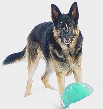 Currently, I have three shepherds watching over us. Jaeger CD, CGC is the sole male and he is King of the Jolly Ball..He is adored by Libby CD CGC , talker par excellance & mother of #29 , and Sayre, the baby of the pack. Sayre takes guarding the property to new levels , fending off even the most fierce of chipmunks.Once you have been asked inside she thinks nothing of standing on your lap to bestow upon you her most generous kisses.