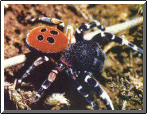 The Eresidae family of spiders contains over a hundred tropical and sub-tropical species, but is absent from America and Australia. They do bear some resemblance to the Salticidae. They have the same thickset silhouette, stocky legs and triple row eye arrangement. In some species the female can grow up to 2 inches, the males are generally only half the size of the female. The male, shown above does not show his beautiful coloring until his final molt.