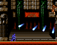 G AMEPLAY: A simple platform game. Batman can run and jump or stick to the walls. Unfortunatelly there isn't the infamous grappling hook. In order to defeat his enemies he can punch them or throw various weapons at them, such as batarangs etc. The control is a bit unresponsive. The level of difficulty is pretty high and there are no passwords. Each time you lose a life you go at the beginning of the stage. The levels follow the story of the film very loosely. You will travel through the city streets, Axis chemicals and a sewer to reach Gotham Cathedral where you will face Joker. There are various bosses at the levels, and some of them are frustratingly hard to beat.O VERALL: A typical below average film-licensed game. If you want to play a Batman game based on the first film, you better try Batman 1 for Genesis or the MAME Batman game. The NES version is nothing worth mentioning... |