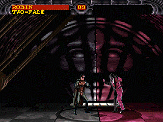 The time ticks away on the screen as you move around the big top fighting more criminals. There are extra time bonuses available on this level to make it easier. Next is Two-Face's hideout in a warehouse, with crates hiding pickups and henchmen. Background objects also can be moved via secret switches, and you must also battle with Two-Face's consorts Sugar and Spice before facing the man himself. The action moves to the Ritz Gotham, where Eg Nygma (The Riddler) has thrown a party for the wealthy, in a ruse to rob them. Trap door switches can render enemies harmless, as Batman and Robin battle through this level. Next comes an Abandoned Subway Station, where one of the thugs blows a hole in the floor. The fight continues on top of a speeding subway car and finally inside the train itself. Then it moves onto Wayne Manor and the Destroyed Batcave. At the party The Riddler discovers the real identity of Batman and the location of the Batcave. The duo must fight the henchmen here and save the cave from being burnt to the ground, along with Bruce's home. The final battle is set on Claw Island, where Two-Face and The Riddler have kidnapped Dr.Meridian. You fight your way into the hideout and face more booby traps until you get to the throne room, where you face the two enemies. The Riddler has a super strength outfit through which you must defeat him and his bursts of mental energy. |
