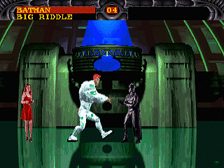 The cut scenes tend to just get in the way and would have been better if they were from the film. The copy protection means that you have to have the CD-ROM in your drive to play the game, and if you remove it, the game will crash (according to the manual). The game is not as enjoyable as the Mortal Kombat series, which even though I've never completed, I still like to play from time to time. The characters are smaller in Batman Forever, to give more room for the movement aspect of discovering items, but even though they are all digitised from real actors, they don't quite move naturally. |