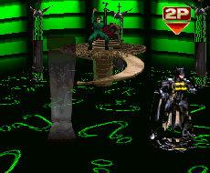 The player select screen! There are two beautifully rendered images for Batman and Robin, obviously modelled after the film actors (Val Kilmer as Batman and Chris o'Donnel as Robin). The sound is not great, but a lot better than the graphics. There's some decent music that fits to an action game and some cool SFX and sampled voices. But the decent sound cannot save this game. All in all, this game is dreadful. A real disgrace to the Batman license. It looks poor and it plays awful. If you don't like Batman you don't need to see it, and if you do just see it for as cheap as possible to find-out by yourselves what a shameless cash-in it actually is. The pictures below are taken from the bleem! Emulator, and they are trimmed but not resized, so they show the game in its native resolution. |