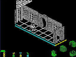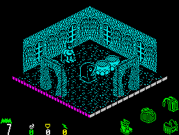 Robin didn't go without a struggle. The seven parts of the Batcraft, which he was servicing at the time of the snatch, are scattered all around the Batacombs. And before Batman can rush to his rescue, he must find all the bits so that they can be teleported to the launchpad, situated at the top of the very highest tower. The game ends when Batman's sitting in the reassembled craft ready to rescue Robin and bring the Gotham gangsters who got him to justice. (Note for Batfans: the reason for having a batcraft instead of the Batmobile is that a vehicle with wheels would've taken up too much memory!) |