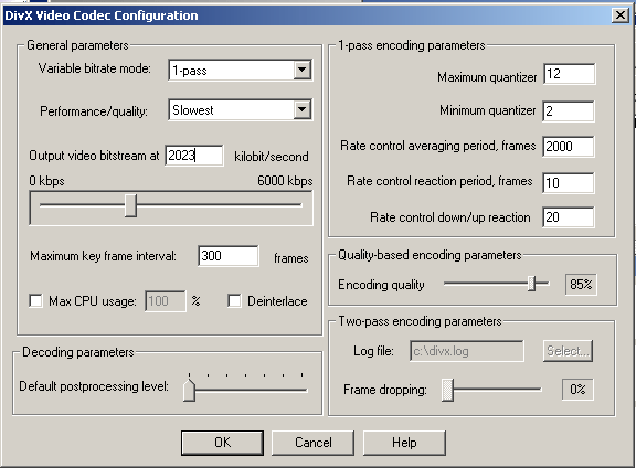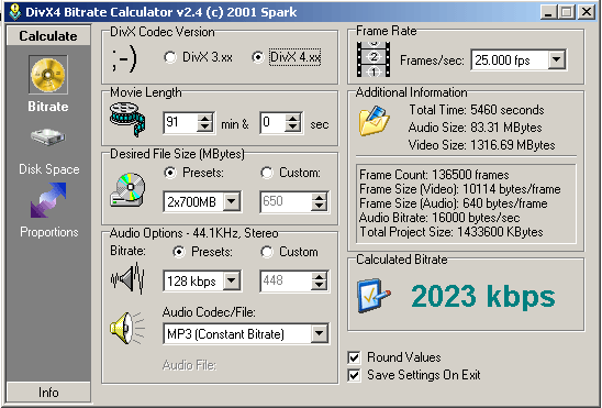 Calculator All you need to do here is to choose the DivX codec.Next you need to enter the movie length which is why itold you to note it down earlier. Pick a frame rate 25.000fps for PAL and 29.970fps for NTSC. (You can find out which region your DVD is by looking on the back on the case) Make sure you note down the Calculated Bitrate (in this case 2023kbps) as you will need this later. |