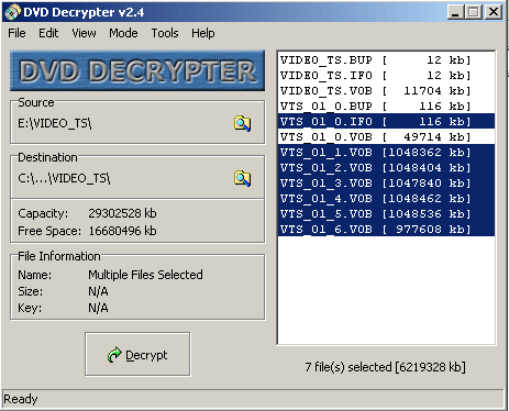 Step 1 Decrypting. (Copying the contents of the DVD to your Hard Disk aswell as Decrypting them). Nice and easy just place your dvd into the drive open up DVD Decrypter chose the destination (where you want to store the DVD files) and hit Decrypt. It couldnt be any easier. The length of this process depends greatly on the speed of your DVD Drive. If you are running Windows 2000 or XP you may need to firstly install an Aspi. This can be found here. |