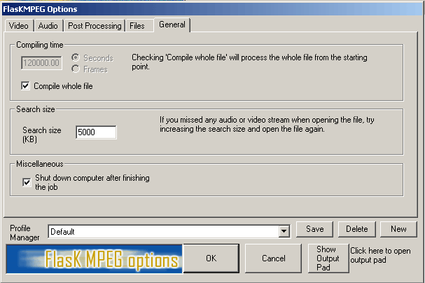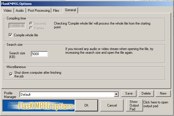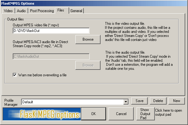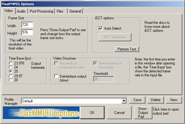 | In the Video tab you do not have to alter anything as FlaskMPEG automatically configures it for you. Just be sure to check that the fps matches the reigion of the DVD. 23.976 and 29.97 are region 1 and 25 is region 2. if you are using a region 1 film and the time base is 23.976 then make sure that you do check the Deinterlace box. | ||||||||||||||||||||||||||||