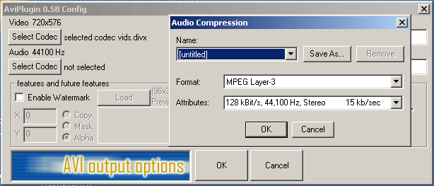 to the Audio Codec if MPEG Layer-3 is not on your list then Click Here to download it. The audio compression settings should be set up EXACTLY as you see them here. (Format= MPEGLAYER-3 Attributes= 128 kbit/s Stereo) Then click on ok and ok again. |