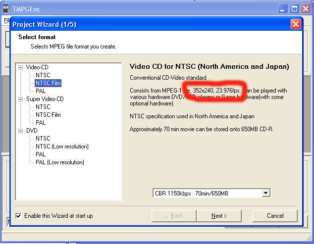 | Next open TMPGEnc and you should be presented with a screen that looks similar to this. Now simply chose which format you would like to convert your file to (in this case VCD) "NTSC Film" has been selected as this is the required frame rate for this conversion. The red circle shows where to look to ensure you have selected the correct frame rate. The box a the bottom is simply to show you how much large the end result will be. (MPEG - 1 is the format used by Video CD's). | |||||||||||||||||