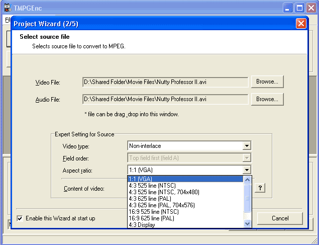 otherwise just leave it the same as the "Video File" source. For the "Video type" select "Non-interlaced". Field order (just ignoor this box). For the "Aspect ratio" simply select 1:1 for a computer monitor or 4:3 for a notmal TV and 16:9 fot a Widescreen TV. (If you are unsure just chose 4:3 Display) "Content of video" ignoor this box too :-) |