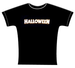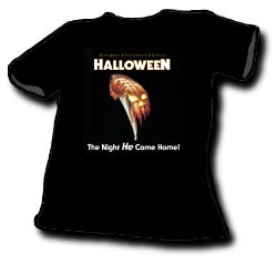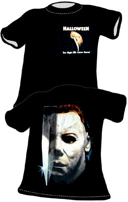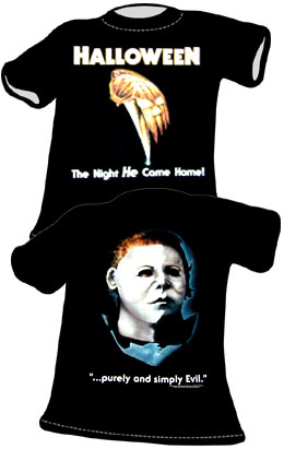 $19.95. Black 100% cotton t-shirt features the origional Halloween logo on the front and Michael Myers visage with "...purely and simply Evil." on the back.